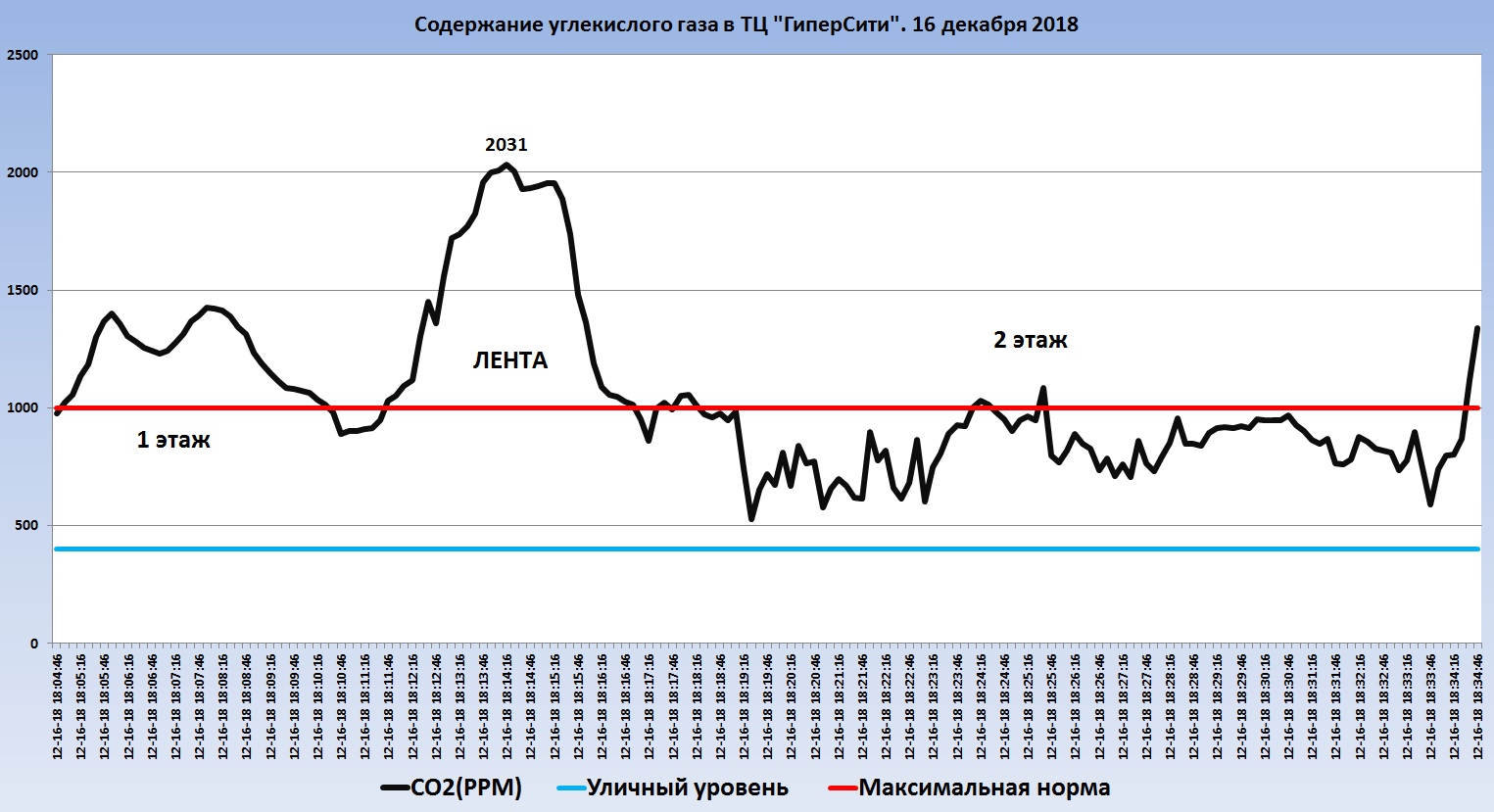 В целом я остался доволен качеством воздуха в ТЦ. На первом этаже концентрация CO2 была выше нормы, чем на втором. Это объясняется тем, что углекислый газ очень тяжелый и аккумулируется в низинах. Если на первом этаже цифры колебались от 1000 до 1400 ppm, то на втором от 500 до 1000 ppm. Совсем меня огорчила только «Лента». В гипермаркете были зафиксированы самые рекордные значения. Максимум – 2031 ppm, что в два раза выше допустимой нормы и в 5 раз выше уличных значений. Сразу скажу, что в «Ленте» очереди тянулись почти до середины зала, а максимальные значения фиксировались у холодильников с рыбой.